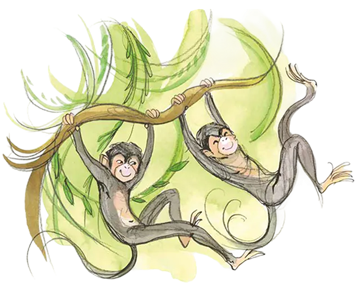 Snel klimmen de aapjes een boom in. Ze slingeren langs de vijf dikke bomen terug naar huis met een prachtverhaal.